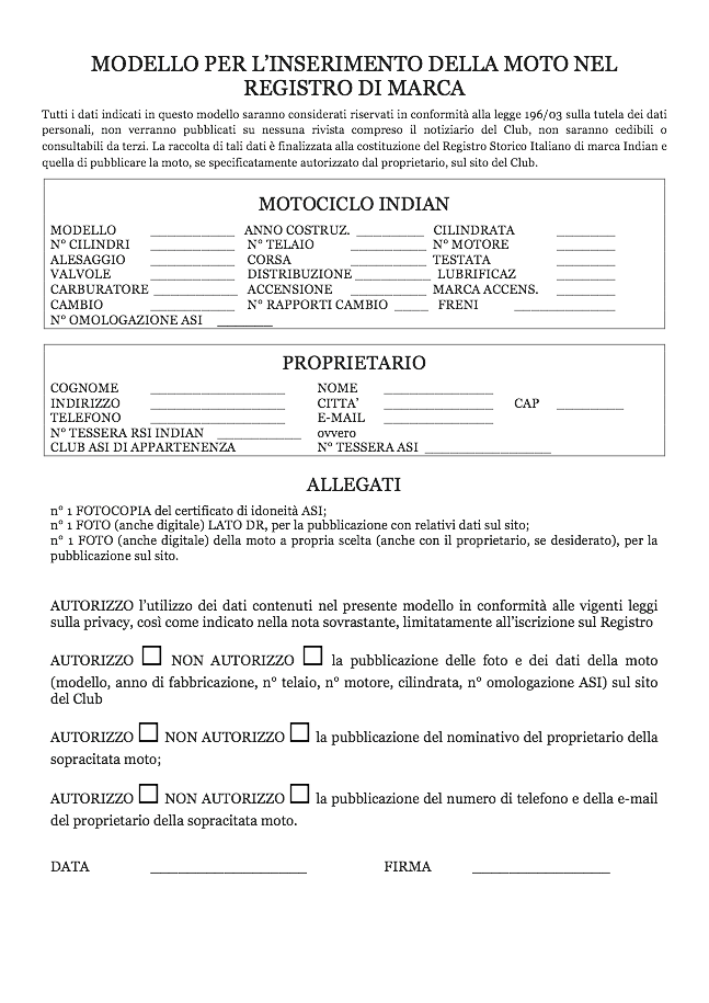 Al fine di mantenere aggiornato tale Registro, che è patrimonio di tutti gli appassionati del settore, chiediamo ai possessori di motocicli Indian di aderire al Club e di iscrivere la loro moto al Registro, inviando, per e-mail o per posta, la documentazione e i dati come dal seguente modello.